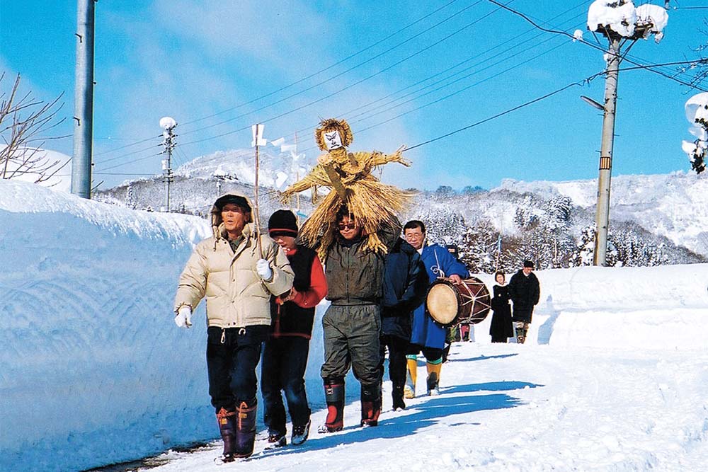 ワラ人形に地域内の疫病を背負わせて地域の外に送り出し、人形を地域境の木に結びつけ、外から疫病が入るのを防ぎ、一年間の無病息災を祈る行事です。
