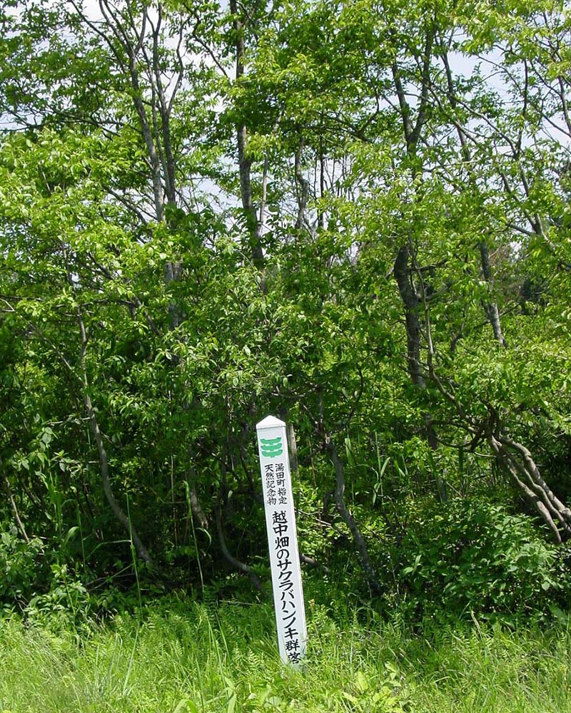 越中畑のサクラバハンノキは自生地として北限であり、約66aの広大な面積に500本以上が群生し、町の天然記念物に指定されました。木立の中のユキツバキは街道の両側に群生し、例年5月10日~13日頃が見頃になりその情景は圧巻です。国境は戊申戦争の歴史も感じられるなど、とても興味深い場所です。